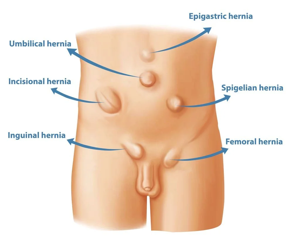 A hernia is essentially a hole in the abdominal wall that has gone through the muscles and connective tissue layers. They are caused by a combination of increased internal pressure and weakness from the abdominal wall. Common sites for hernias include: